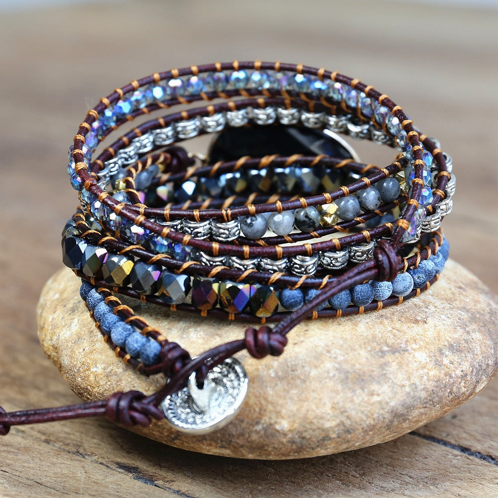 A Fusion of Bohemian Elegance and Natural Beauty Embrace the unique charm of our Handmade Leather Bracelet, featuring a captivating mix of five strands woven together with precision. This bracelet, adorned with black Onyx beads, embodies a bohemian spirit and artisanal craftsmanship.